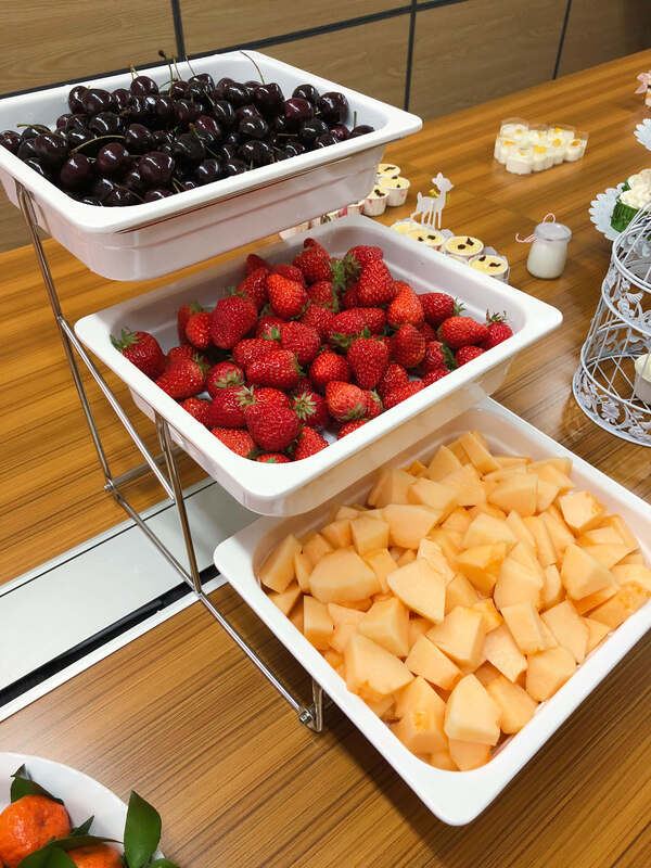 當女生們還沉浸在收到鮮花禮品的喜悅中時,精美的下午茶便出現在大家眼前,數十種甜品,加上車厘子草莓哈密瓜等各種水果,惹得集體男同胞們羨慕不已。幾分鐘后,所有美食被一掃而空,真是滿足。