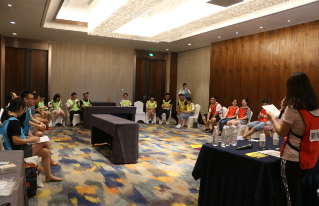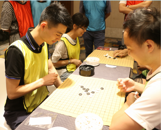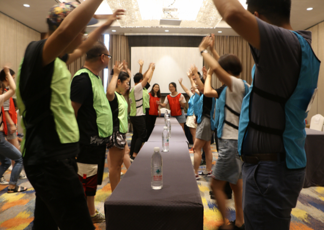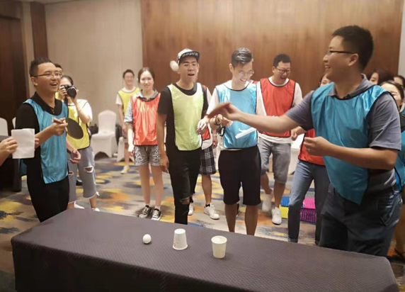 下午則是一場腦力和體力的對抗賽——名牌大戰(zhàn)。名牌大戰(zhàn)之前共要進行3個游戲環(huán)節(jié),獲勝隊伍可以贏得第四環(huán)節(jié)的復(fù)活權(quán)。第一個游戲是趣味接力賽,共有飲料大戰(zhàn)、夾豆、指壓板跳繩和乒乓球接力四個項目,總用時最少的一隊勝出。此環(huán)節(jié)尖叫聲此起彼伏,每組都拼勁全力爭分奪秒。第二個游戲是搭紙牌,全隊人員各有分工,充分展示了團隊協(xié)作力。接下去的棋牌大作戰(zhàn)中,每組每個人都可以成為攻擂方和守擂方,調(diào)動了每一位成員的積極性。