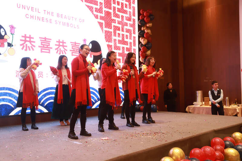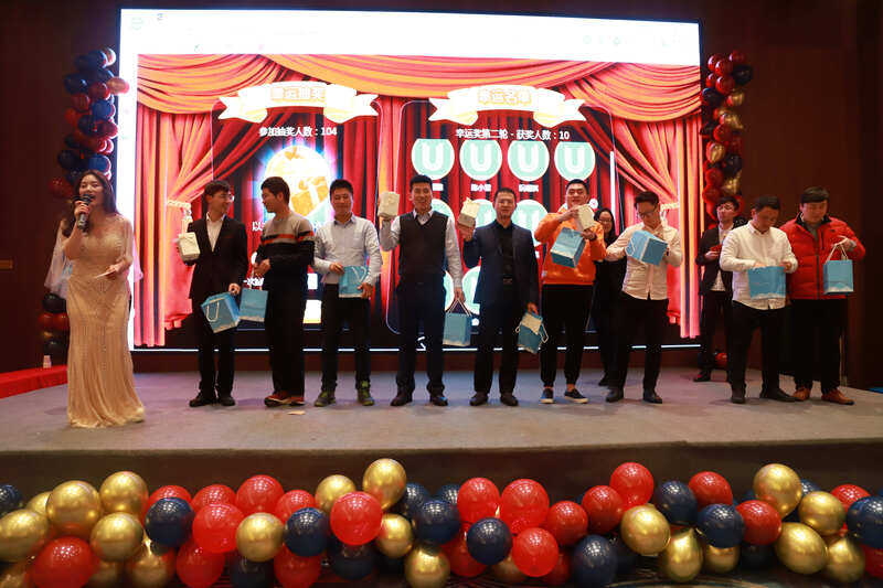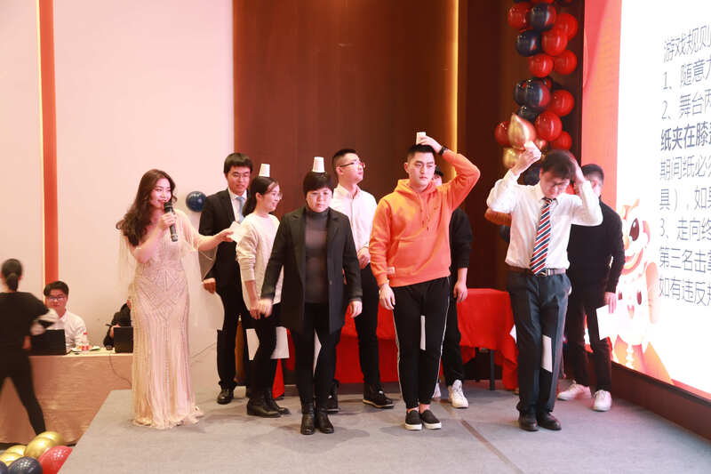 會(huì)議結(jié)束后,大家陸續(xù)到達(dá)晚宴地點(diǎn)。一進(jìn)門,就看到兩位大財(cái)神正捧著金元寶在發(fā)入場(chǎng)紅包,場(chǎng)地的桌椅都鋪上了喜慶的大紅布,伴著《新春序曲》的音樂,年會(huì)的熱鬧勁兒撲面而來。晚會(huì)上,小人舞、3D游戲、抖乒乓球比賽、熒光舞、驚喜環(huán)節(jié)、相聲合唱不一而足,頗具新意。當(dāng)然晚會(huì)也少不了各種抽獎(jiǎng)活動(dòng),幸運(yùn)大屏滾動(dòng),每個(gè)小伙伴彼時(shí)都希望自己成為幸運(yùn)的錦鯉,而不定時(shí)的搶紅包環(huán)節(jié)更是讓現(xiàn)場(chǎng)伴隨著陣陣尖叫。