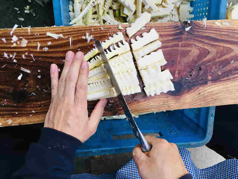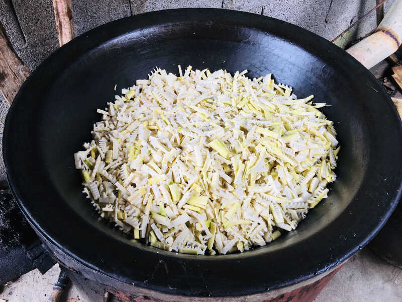 剝筍、洗筍、切筍完成后,就是燒筍的步驟了。拿出一口能裝下公司兩個苗條妹子的大鍋,將新鮮的筍悉數倒進燒制。其他配菜也是必不可少的:烤麻糍、烤玉米、烤地瓜……體會完童年的樂趣,嘴巴自然也不能閑著,大家你一口我一口,吃得不亦樂乎。