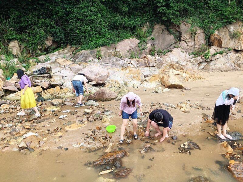 到達(dá)海邊民宿后,大家迫不及待地放下行李,分頭去海邊玩耍。有些人開始放桿釣魚,有些人便在巖礁抓螃蟹挖貝殼,大家放肆地挽起褲腿,放下平日的矜持,找到一塊好看的海螺便立刻呼朋引伴,邀請他們前來觀看。