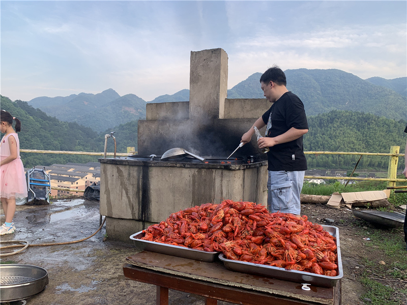 在做了一些簡單的破冰游戲后,太陽也快下山了,大家搬來100斤的龍蝦、60斤的牛蛙和三大箱的燒烤食材,開始為晚宴而忙碌著。很快,爐火燒旺,青煙裊裊,油刷不斷地在烤架上來回穿梭,像是一位舞者,盡情展示香甜美味。圓鼓鼓的熱狗在烤架滾燙中,爆出陣陣誘人香味,再撒上孜然粉更是讓人垂涎欲滴。大家喝著啤酒,吃著肉,享受著這一刻的歡喜。